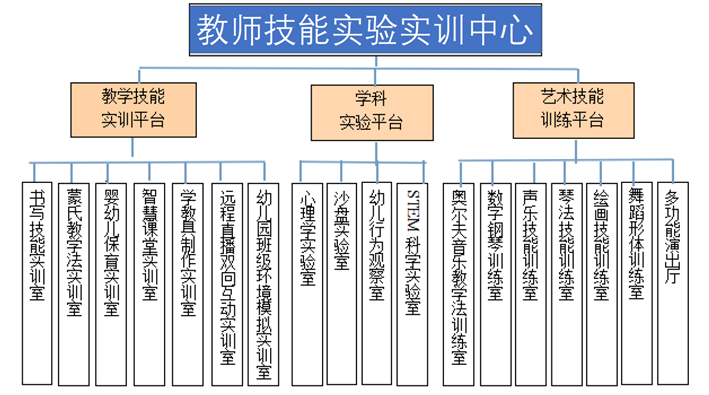 艺术技能训练平台拥有:网上智能管理的现代化琴房38间,总面积达到200平米;舞蹈形体训练室2间,300平米;数字钢琴训练室2间,200平米;声乐技能训练室1间,53平米;绘画技能训练室2间,106平米;多功能演出厅150平米,奥尔夫音乐教学法训练室53平米,总面积约1100平米,面向声乐、舞蹈、琴法、美术等课程教学和训练,满足幼儿教师艺术素养培养和提升的需求。训练平台中各训练室承载着课程教学、技能训练、展览展演的功能,是培养师范生艺术素养的强力支撑。