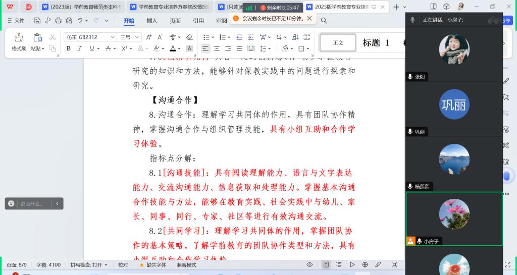 2023年6月25日,太阳成tyc33455ccwww举行学前教育专业人才培养方案修订研讨会,针对2023版人才培养方案的修订进行了研讨。本次人才培养方案修订是在对照学前教育专业师范专业认证过程中专家整改建议的基础上进行的,我院对培养方案的培养目标、毕业要求、课程安排情况等进行了修订。后期还会对修订结果请校内外专家及一线教师进行论证。参与本次人才培养方案修订研讨会的有太阳成tyc33455ccwww相关领导、系主任等,本次研讨会通过腾讯会议在线上进行。