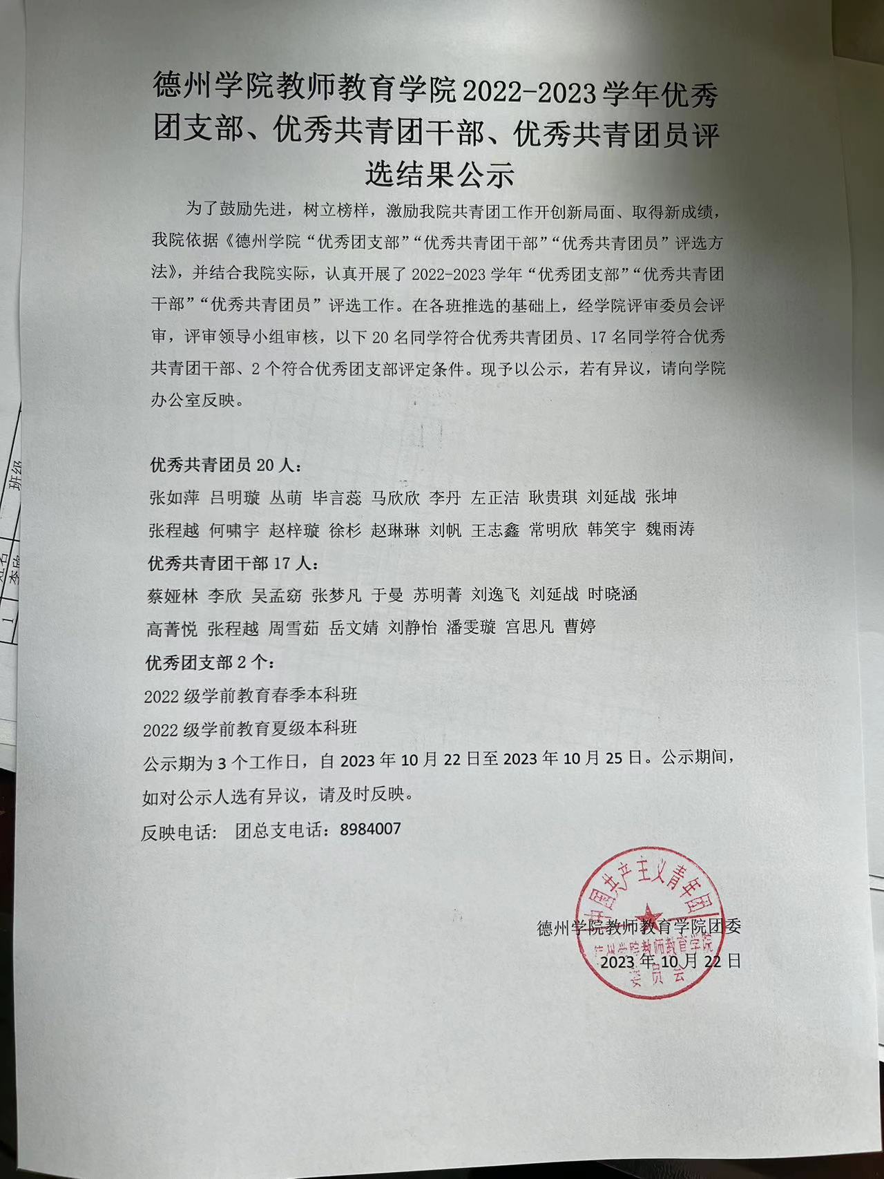 为了鼓励先进,树立榜样,激励我院共青团工作开创新局面、取得新成绩,我院依据《太阳成tyc33455ccwww“优秀团支部”“优秀共青团干部”“优秀共青团员”评选方法》,并结合我院实际,认真开展了2022-2023学年“优秀团支部”“优秀共青团干部”“优秀共青团员”评选工作。在各班推选的基础上,经学院评审委员会评审,评审领导小组审核,以下20名同学符合优秀共青团员、17名同学符合优秀共青团干部、2个符合优秀团支部评定条件。现予以公示,若有异议,请向学院办公室反映。