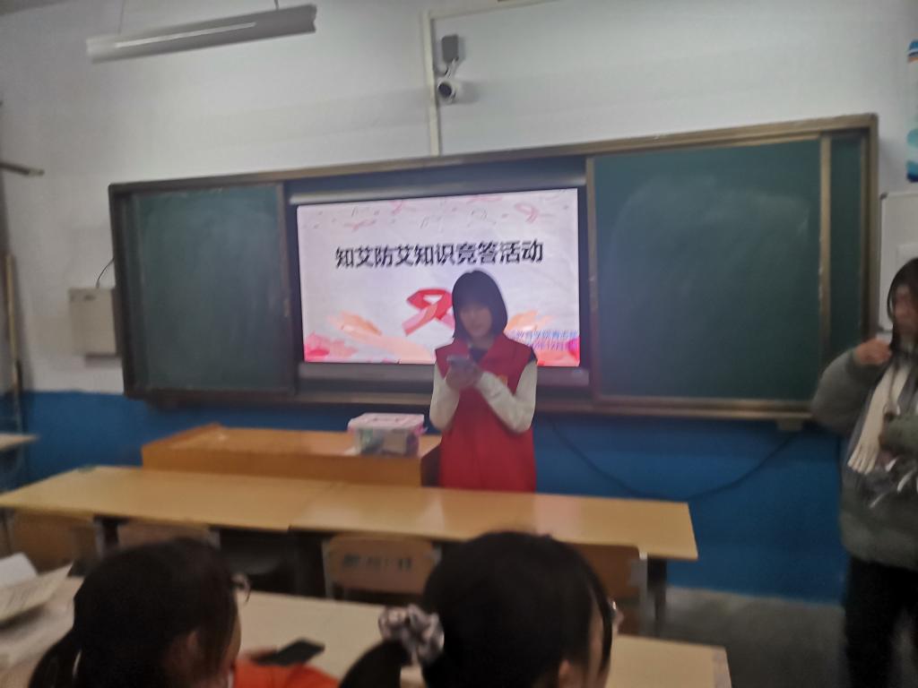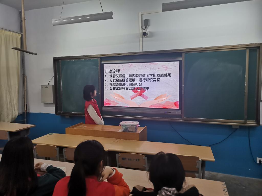 活动伊始,负责人进行点名。随后由主持人讲解有关艾滋病的知识,播放防艾的宣传视频,并请同学来说一说自己的心得体会。然后,由负责人出示准备好的题目,让同学们开始进行知识竞答,由负责人员进行巡查,确保成绩真实有效。最后,由负责人收集作答纸,进行现场评分,公布本次活动的成绩,并邀请各位同学进行合影留念。
