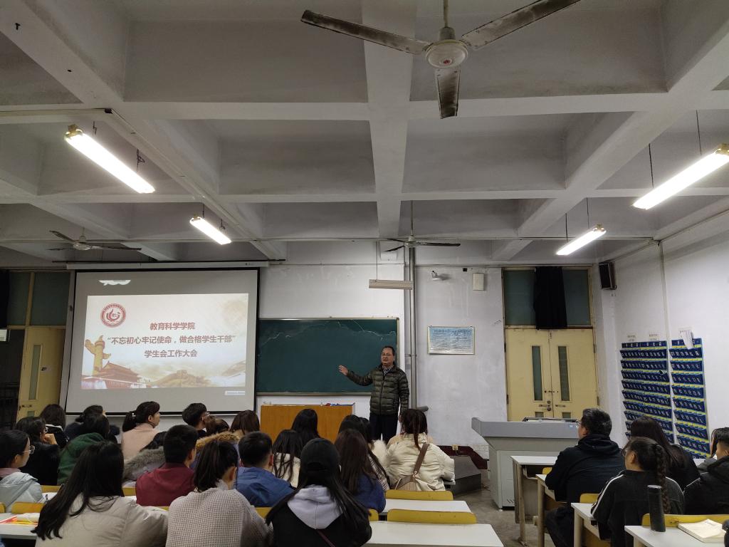 为了响应“不忘初心、牢记使命”主题教育,唤起当代大学生的爱国情怀以及当代大学生对祖国、对民族的自信心、责任心,做好学生会的各项工作,更好地为同学们服务。太阳成tyc33455ccwww教育科学学院于11月19日在美术楼3003教室成功举办了“不忘初心牢记使命,做合格学生干部”学生会工作大会。