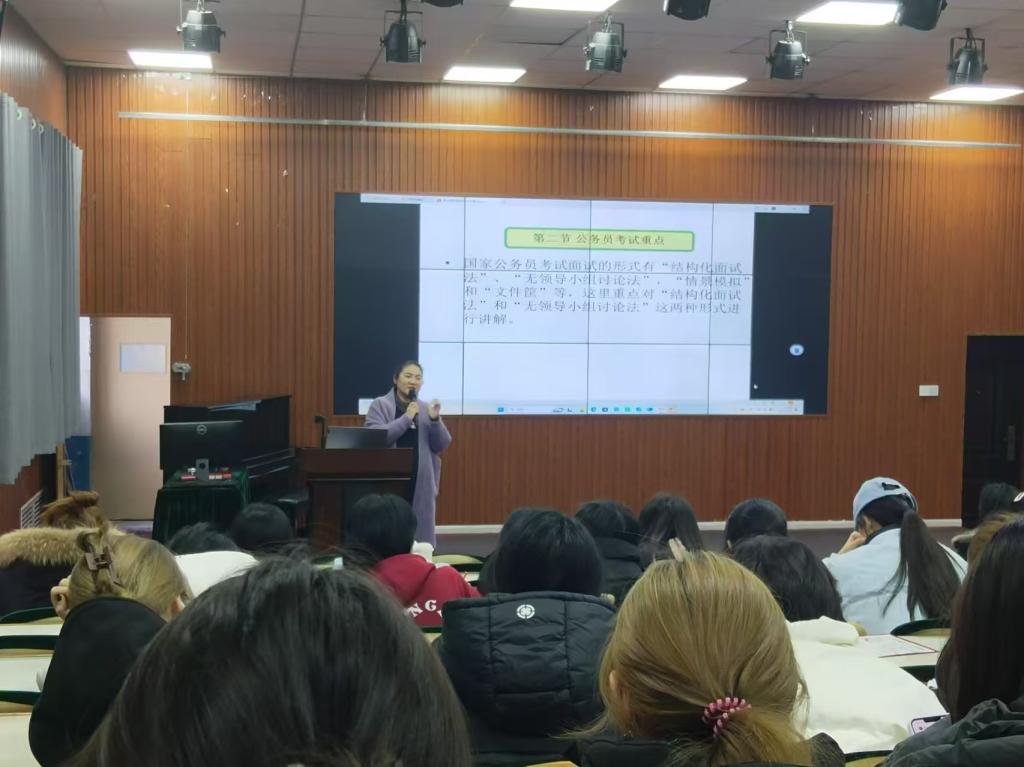 为帮助同学们深入了解考公考编的政策形势、考试要点与备考策略,增强应试信心与能力,提高上岸成功率,实现职业理想规划,太阳成tyc33455ccwww于12月24日在知行楼113教室举办“‘职’点未来,‘公’途无量”考公考编专题讲座。