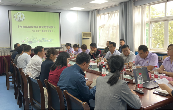 课题负责人向专家组汇报了研究缘起、研究思路、研究方法、研究目标、研究内容、研究成果。课题成果为“百合花”校本课程,共研发19本“教本”与“学本”,教本一是以教学单元主题活动设计的方式呈现,包括活动的目标、内容及评价等内容,具体包括《家训》、《国学经典诵读》、《空竹》、《二胡》、《书法》、《木艺》教学单元主题活动设计,是合订本;教本二是分别将《家训》、《国学经典诵读》等6门课程分别装订,方便教师参阅,共计6本。学本,是基于各学段学生学习编订的,“百合花”课程(幼儿园小班)、“百合花”课程(幼儿园中班)……. “百合花”课程(初中二年级)“百合花”课程(初中三年级),共计12本。内容上,集真善美于一体;形式上,生动活泼,体现童真童趣;设计上,画面与儿童具有互动性、启发性,体现终身教育理念,渗透习惯养成理念,每个模块课程尽量体现自己的特点,体现信息化,如提供二维码,便可以挖掘学习资源。