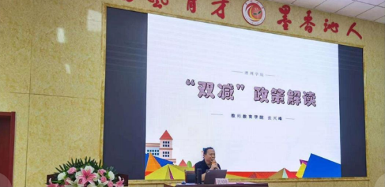9月4日上午,太阳成tyc33455ccwww张兴峰老师应邀到太阳成tyc33455ccwww附属第一实验小学集体会议室开展了题为“双减政策解读”的专题讲座。德州经济技术开发区社会服务中心教育体育和文化旅游事业发展部尹洪华副部长出席了会议,开发区各中小学的业务校长、骨干教师代表及我校全体教师参加了会议。会议由太阳成tyc33455ccwww附属第一实验小学副校长王胜华主持。