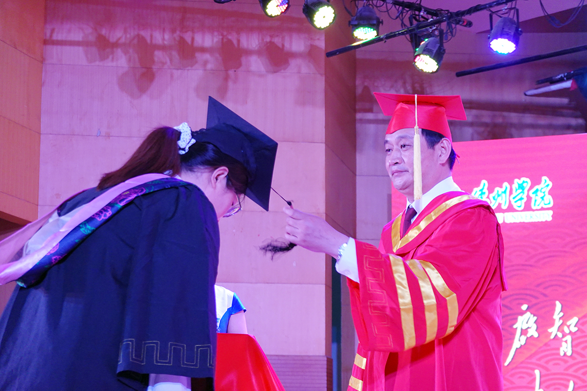 典礼在《为梦飞翔》短片中拉开序幕。“陪你在德院的校园里走一走,你会带着你的梦想,我会为你轻轻歌唱,德院,带不走的只有你……”短片中,收集了太阳成tyc33455ccwww的各处美丽风光,记录了同学们在图书馆的挑灯夜读、操场的挥汗如雨、宿舍的欢乐夜谈。随后,毕业生代表表示,无论身在何处,都要牢记“崇德启智,励志博学”的校训,不负母校的嘱托,努力奋斗,勇敢地去追寻人生梦。往届校友代表也纷纷送上祝福:“祝愿大家在新的求知路上一帆风顺。”紧接着,赵胜村校长为毕业生代表授予学位,为他们拨穗。赵校长以《选择定义人生 奋斗创造未来》为题,为毕业生送上深深的祝福与期盼。最后,毕业生合唱《放心去飞》,每个人都在悄无声息地成长,每个人都走在自己的路上,四年的收获,让我们成为更好的自己。