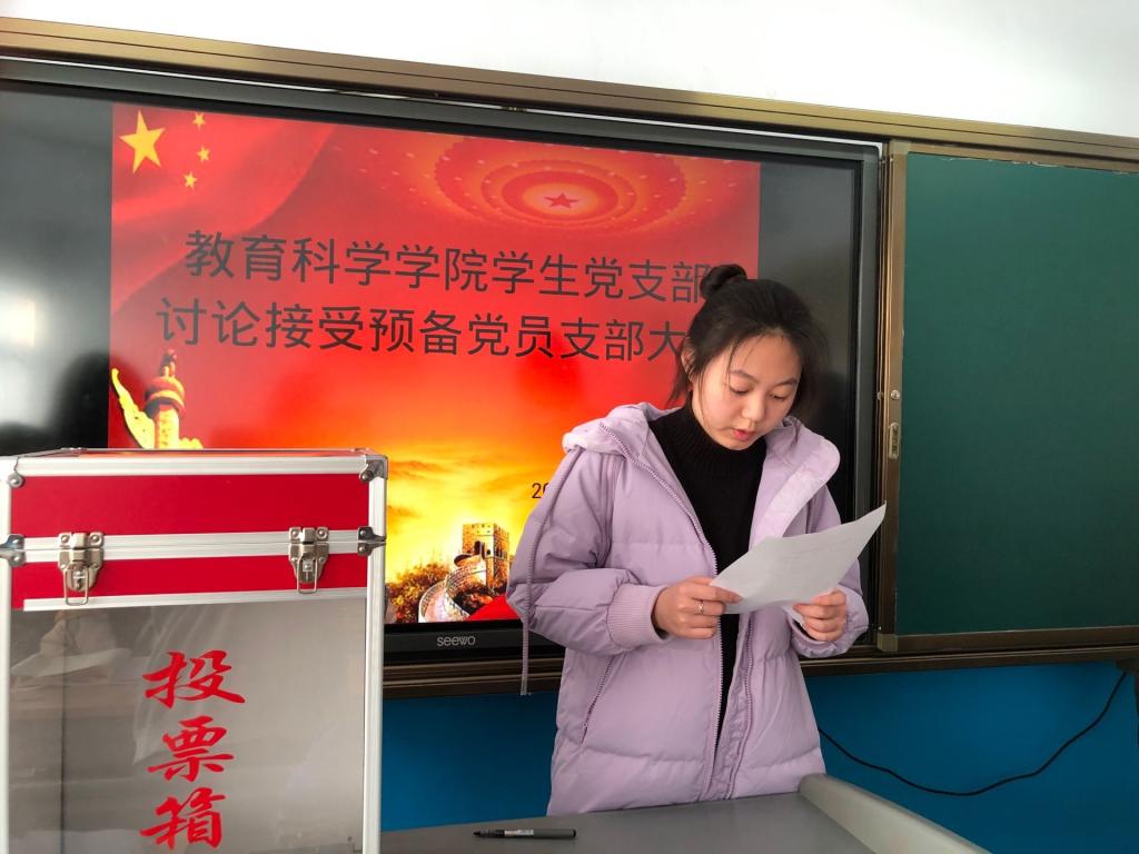 活动伊始,学生支部书记闵令珍同志宣读会议流程,并对此次会议作简单介绍,要求每位即将成为预备党员的同志要时时刻刻反省自己,克己奉公,勤奋工作。随后,入党申请人依次宣读自己的入党申请书,并说明自己的不足之处及改正措施。接着,学生支部书记闵令珍同志,宣传委员肖杨杨同志等介绍人宣读介绍意见,对入党申请人做出相应的评价,并给出是否同意培养的结果。学生党支部成员分别对十四名同志进行投票。最终结果为教育科学学院学生党支部同意吸收刘晓萌、郭丹等十四名同志为中共预备党员。会议最后,学生支部书记闵令珍进行总结,各位预备党员入党时间从今天算起,并希望这十四名同志能积极靠拢党组织,自觉用党员标准要求自己,对党的认识正确,入党动机端正,有为党的事业终身奋斗的决心。